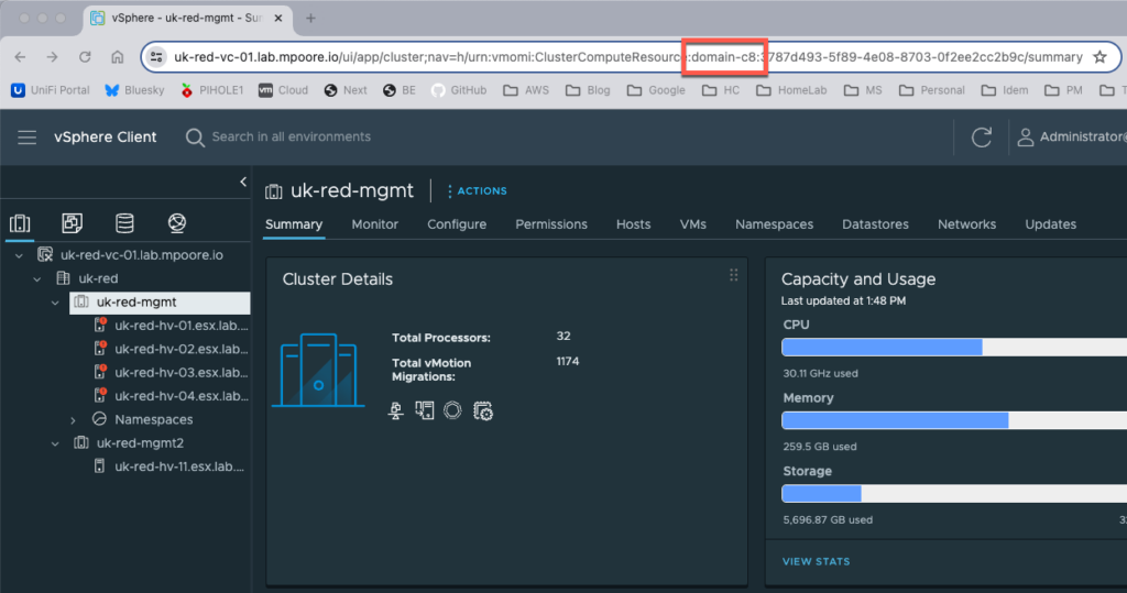 The domain number in the property in step 6 can be found by examining the browser URL when viewing the vSphere cluster in the UI. In this case the number is 8, making the property name ‘config.vcls.clusters.domain-c8.enabled’.